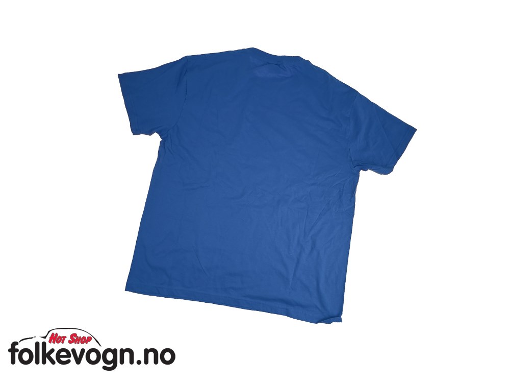 Original SCC Super Scenic t-shirt, blå med Type-2 Bay buss i fjellheimen på framsiden, ikke motiv på ryggen.