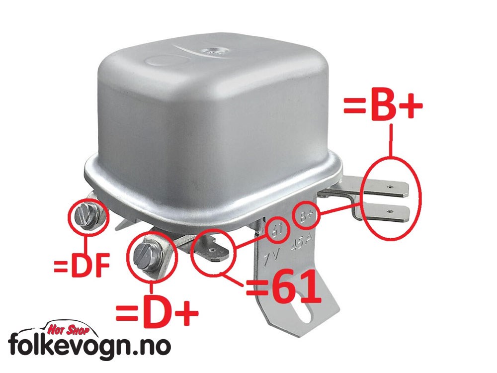 6 Volts regulator til Type-1 Boble 47-66, Type-2 Transporter 50-66 og Type-14 Karmann Ghia 56-66. For plassering på dynamo
