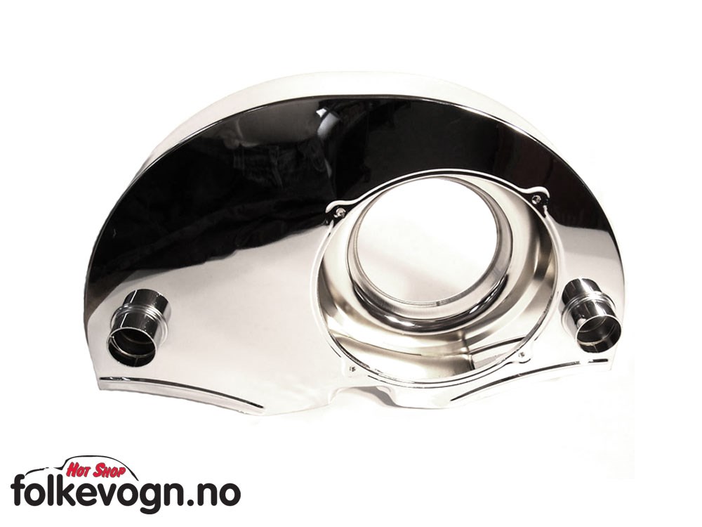 Krom viftehus i 30-hk-style med uttak for varmluft til varmepotter. Passer Type-1 baserte motorer med stående kjøling og oljekjøler inn i viftehuset.