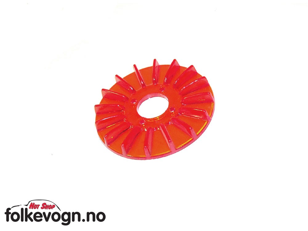 Blått pyntedeksel med finner i gjennomsiktig plast til reimhjulet på dynamoen i Type-1 Boble, Type-2 Transporter og Type-14 Karmann Ghia med stående kjøling. Matcher andre pyntedetaljer til motor i blått