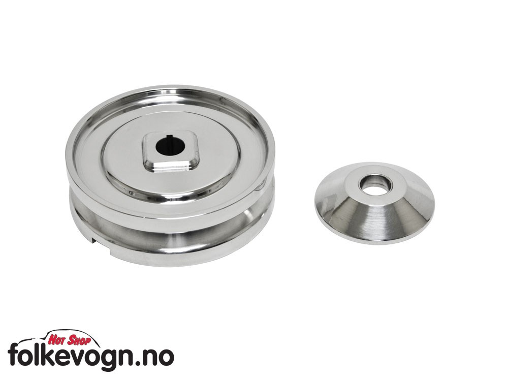 Reimhjul i polert aluminium for 12v dynamoer, vekselstrøm og likestrøm på Type-1 baserte motorer med stående kjøling. Kile til aksling følger med.