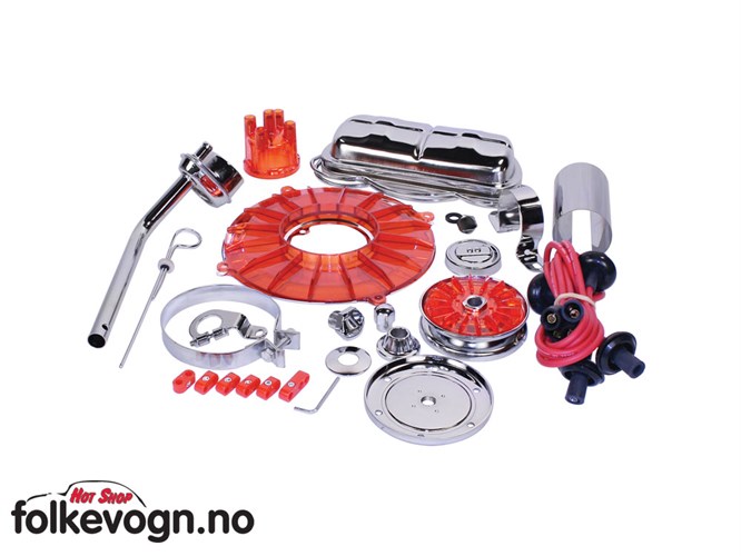 Sett bestående av detaljer til motoren i krom og rødt. En enkel og fin måte å få et oppgradert utseende på din motor i Type-1 Boble, Type-2 Transporter eller Type-14 Karmann Ghia.