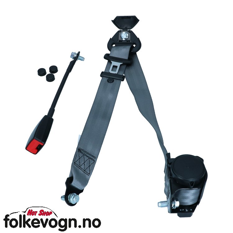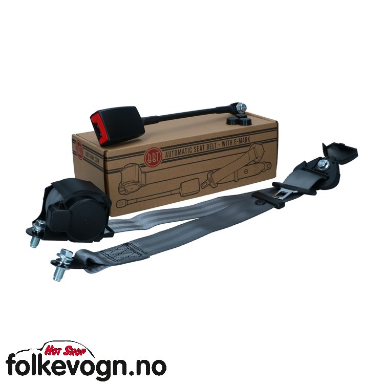 Universal 3-punkt rullebelte i farge Grå med wirefeste tilsvarende originalt i blandt annet Type-1 Boble, Karmann Ghia, Type-3, Golf Mk1 og MK2, Transporter samt flere VW modeller. E-merket.