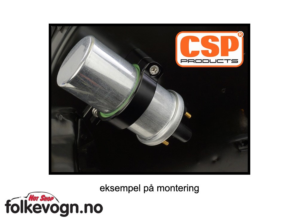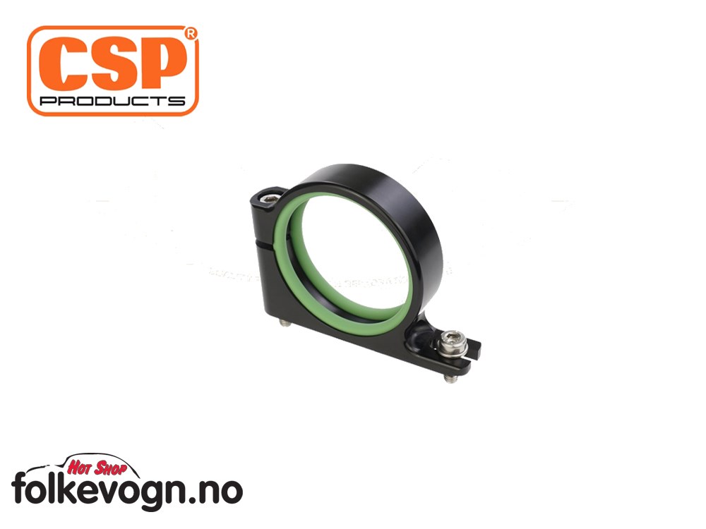 Kraftig klemme i CNC-maskinert anodisert aluminium i sortfarge for festing av Coil på original plass på Type-1 viftehus(inkludert ettermarked viftehus) eller ønsket plassering i motorrom på din klassiker eller løpsbil. Passer tennspoler med diameter 53,5–56 mm