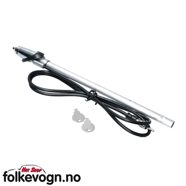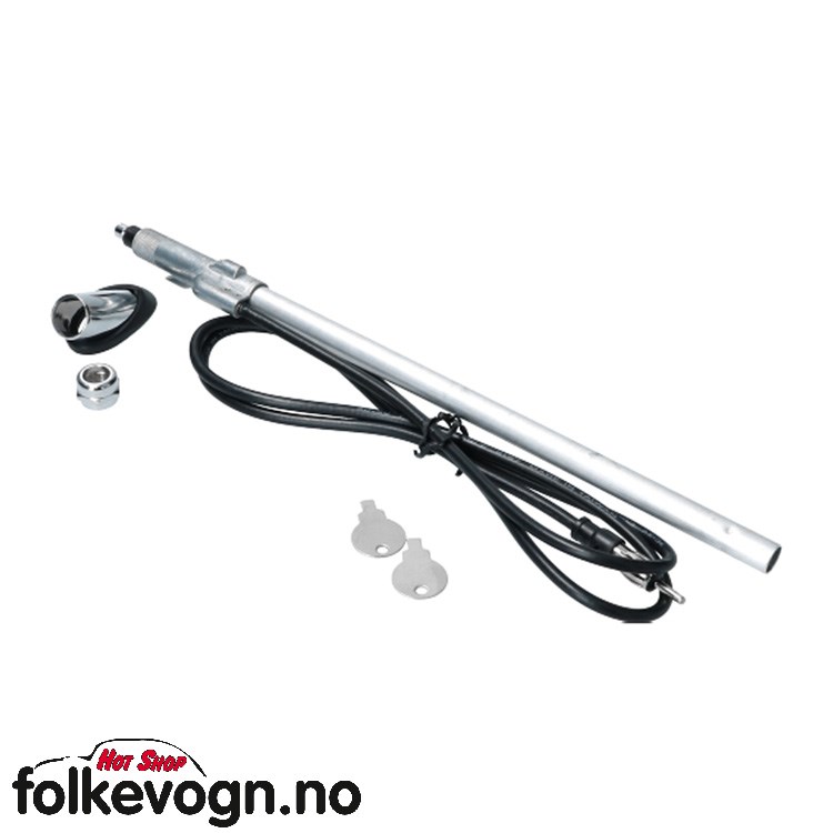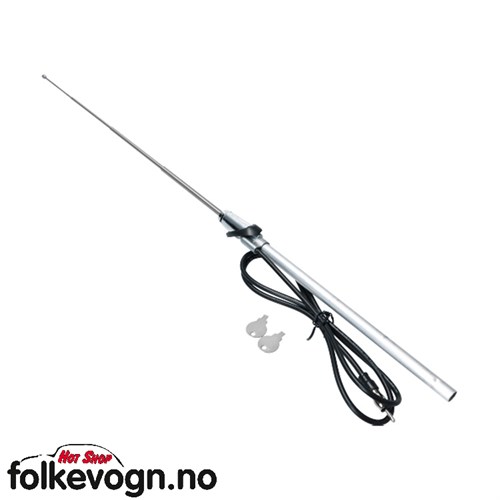 Antenne med buet base, forkrommet. Boble 08/65-, Buss 08/67- For Boble og buss, montering på venstre side av frontruten.|Selve antennen har en uttrukket lengde på 94 cm og er laget av rustfritt stål.