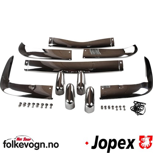 Komplett støtfangersett til både front og bak for Karmann Ghia 1500. Solid utførelse fra JP Group sikrer god passform og stilrent utseende.